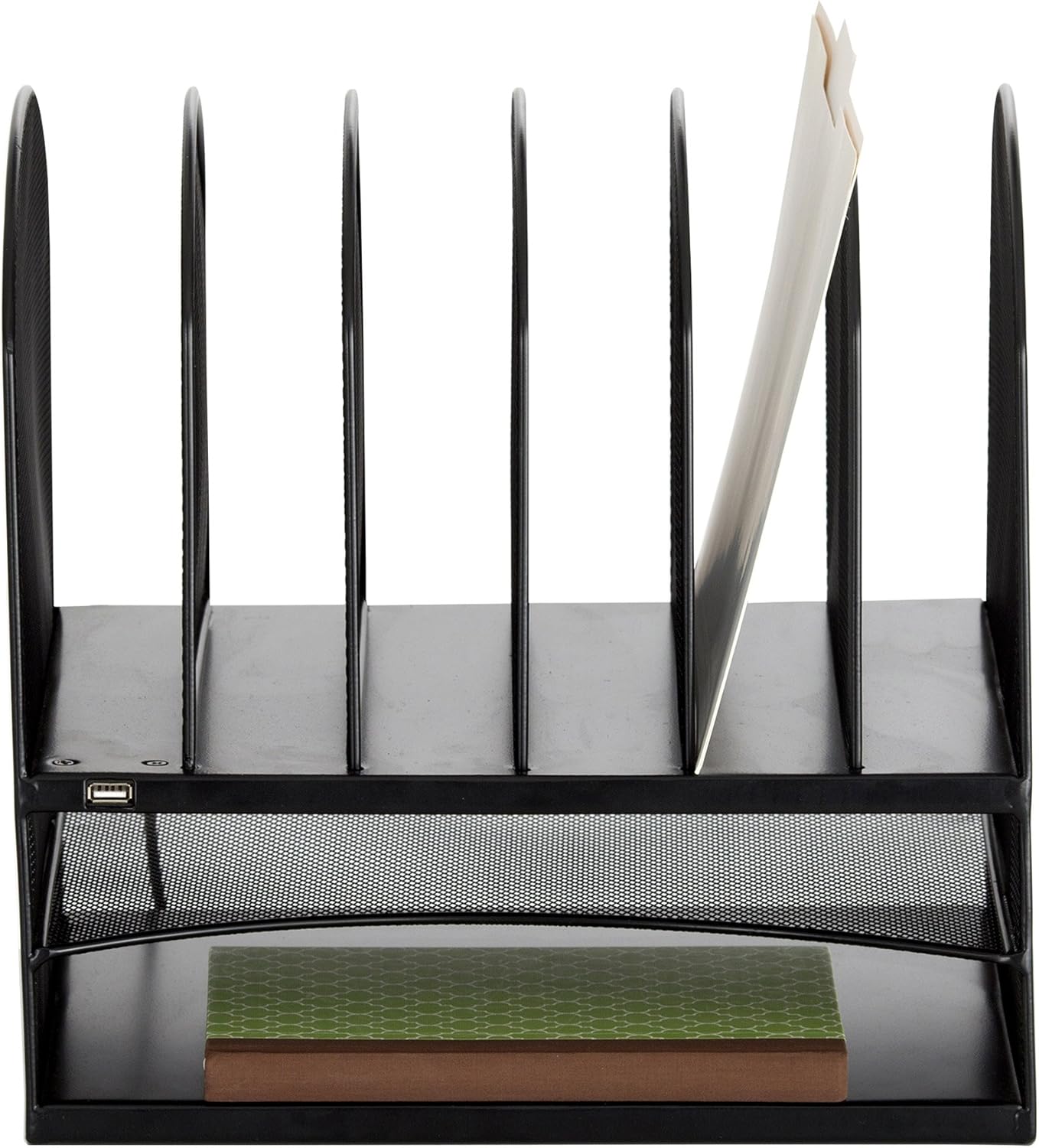 Safco 3233BL Onyx Mesh Powered Charging Station Desktop Organizer with 6 Vertical, 2 Horizontal Sections and USB Port, Black, 13.25"W x 11.5"D x 13"H