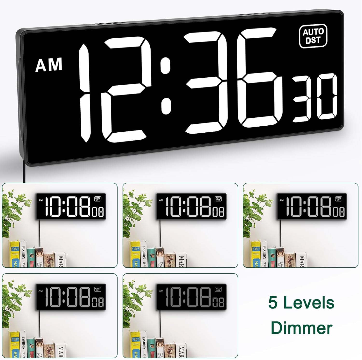 - 𝗗𝗶𝗳𝗳𝗲𝗿𝗲𝗻𝘁 𝗯𝗿𝗶𝗴𝗵𝘁𝗻𝗲𝘀𝘀 𝗱𝗶𝗺𝗺𝗲𝗿 - 5 levels adjustable dimmer, no matter the environment is too bright or too dark you can still see the time by adjusting the brightness with 1 button. If you want to have a good sleep, just set the lowest brightness before going to bed, or turn to the most shining level while your room has sufficient lighting.