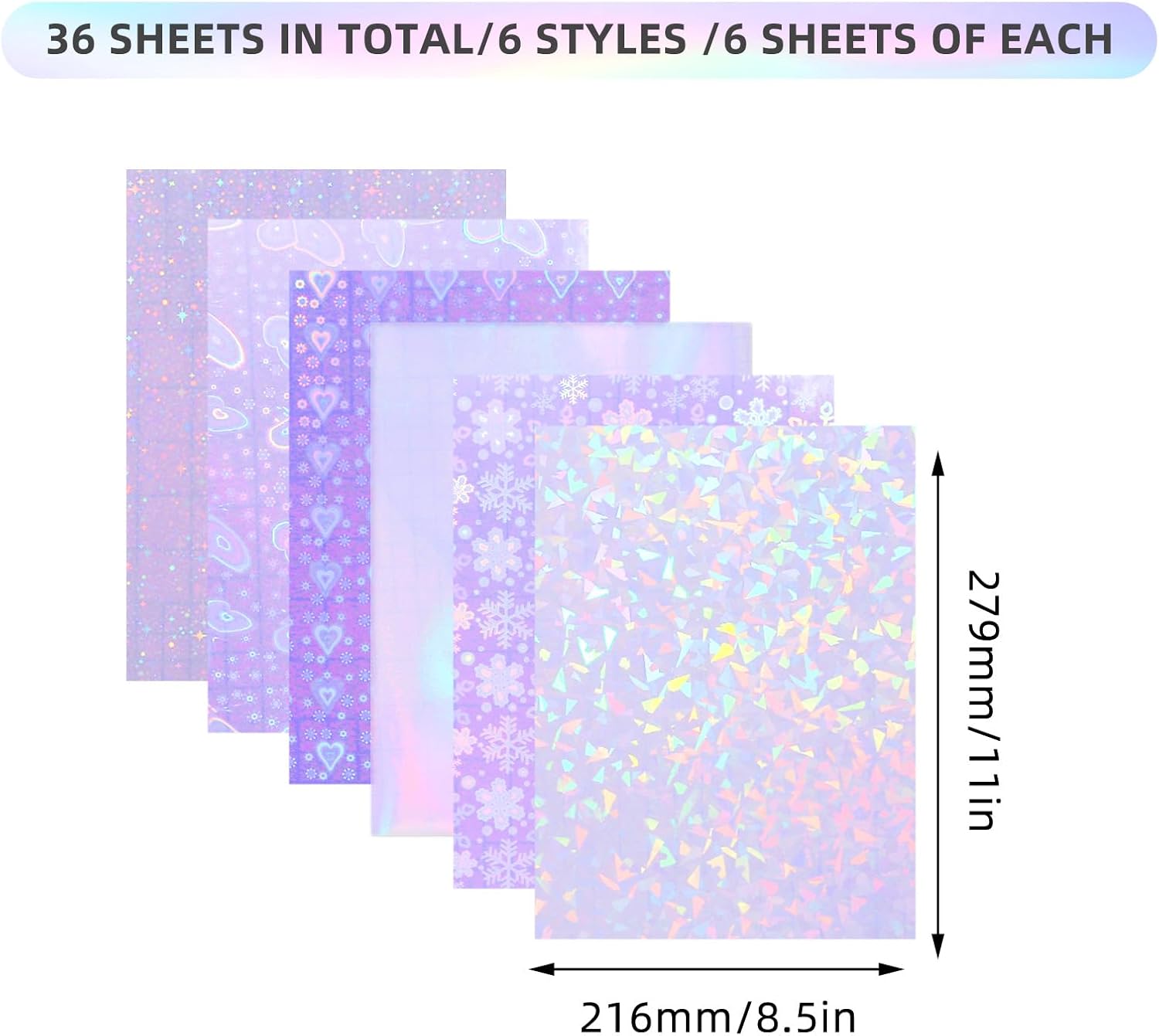 - Ample Package: Our generous package includes 36 sheets of holographic transparent film, each measuring 8.5x11 inches. You'll receive 6 sheets of each pattern - gem, snow, rainbow, butterfly,heart and star - allowing you to customize and create beautiful, shining labels for your crafting projects