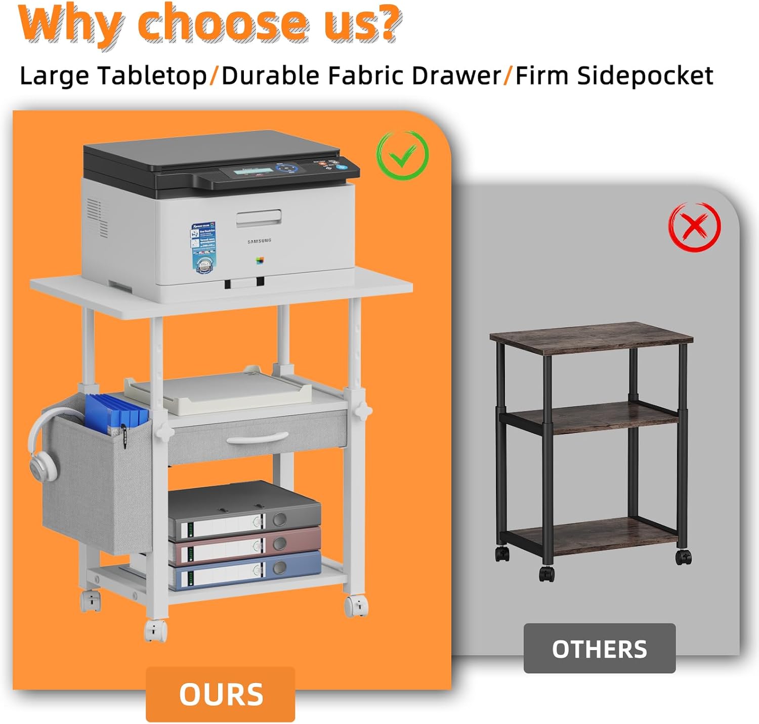 - 【Printer Stand with Storage】Printer table with drawer provide a privacy space to place your desk office items, ensure a clean workspace for home office. Side storage pocket can storage magazines or A4 Paper for convenience get items at hand.