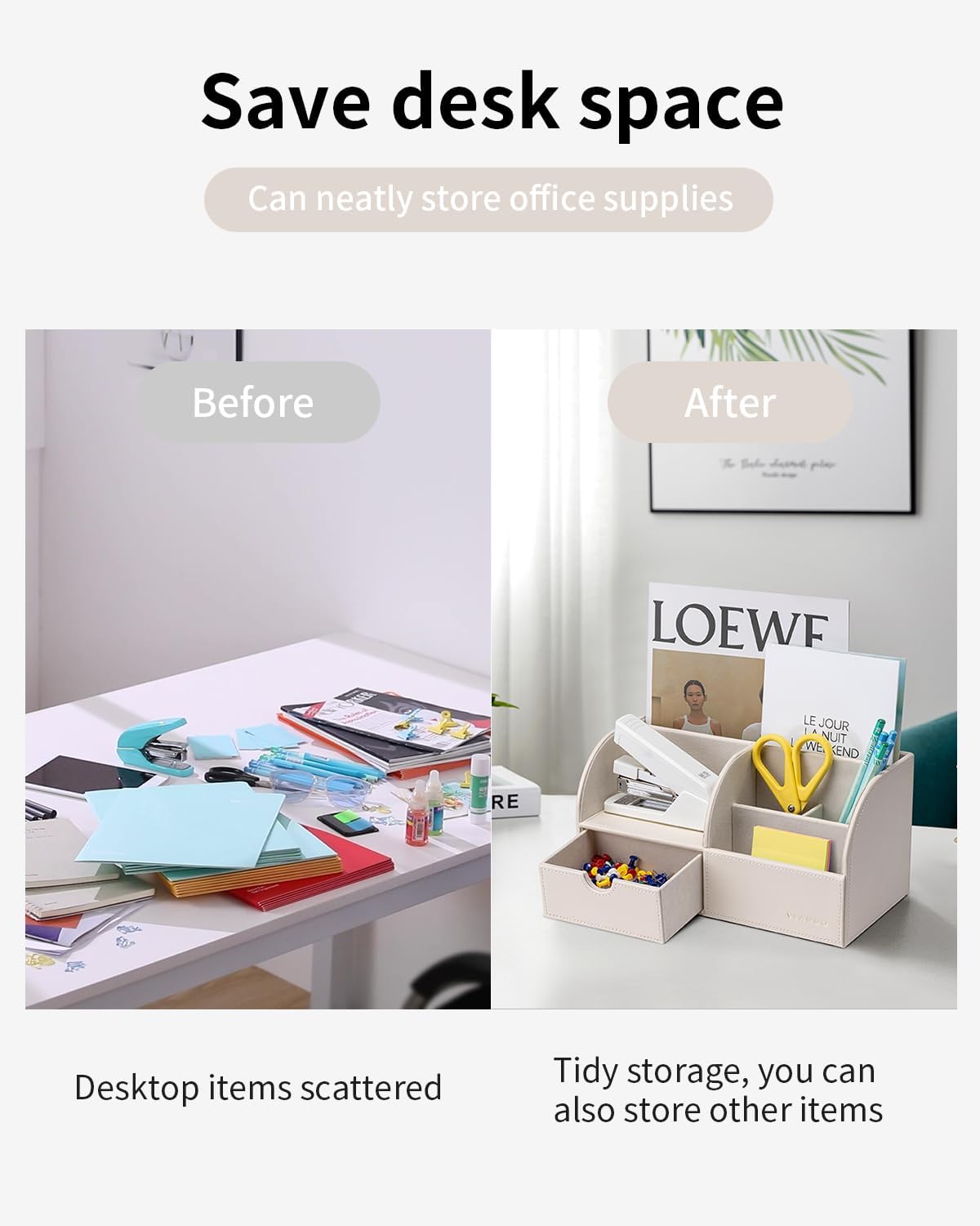Vlando Office Desk Organizer Leather Desktop Organizer Caddy with Drawer for Storing Desktop Supplies and Accessories (White)