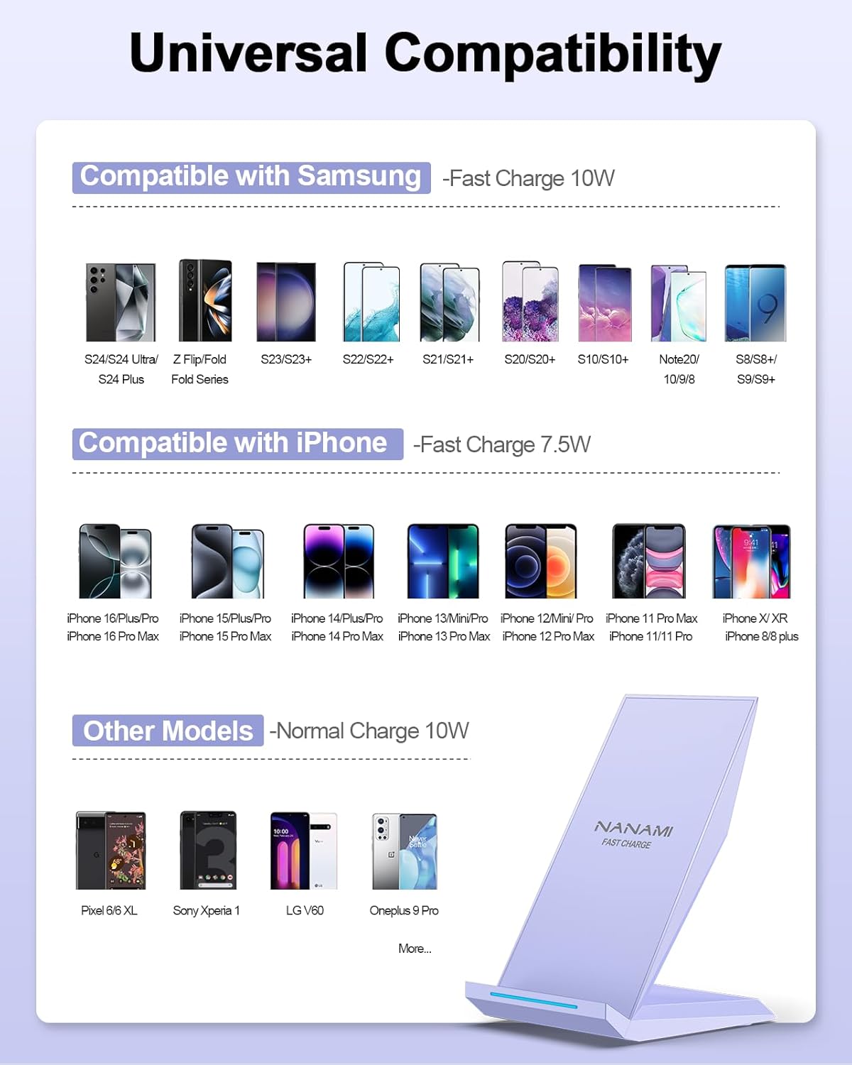- [Two Wireless Charging Modes] - 10W Fast Charge Model: for Galaxy S25/S25+/S25 Ultra/S24/S23/S22/S21/S20/S20+/S20 Ultra and Note 20/20 Ultra, required QC 2.0 or above adapter as its power source(Not Included); 7.5W Fast Charge Model:for iPhone 17/17 Air/17 Pro/17 Pro Max/16/16 plus/16 Pro/16 Pro Max/15/15 plus/15 Pro/15 Pro Max/14/14 plus/14 Pro/14 Pro Max/iPhone 13/13 mini/13 Pro/13 Pro Max/12/12 Pro/12 Pro Max/11/11 Pro/11 Pro Max/XS/XS Max/XR/X/8/8 Plus; 5W Standard Charge Model: Standard QI enabled devices like Pixel 3/3XL,Samsung S6/S6Edge; Some device may require the additional Qi wireless receiver.