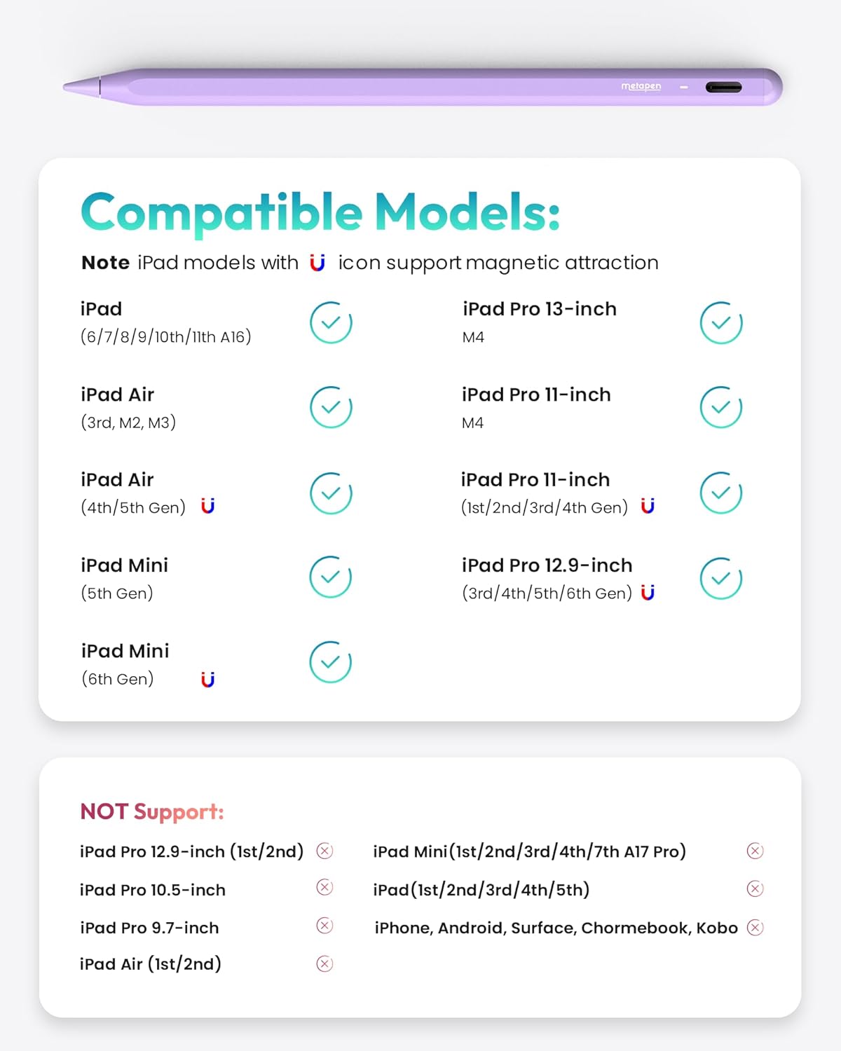 - 【Make Sure Your iPad Model is Compatible】: Metapen Pencil A8 is ONLY compatible with the iPad models 2018-2025: iPad 11/10/9/8/7/6 Gen, iPad Pro 13 inch M4, iPad Pro 11 inch 1/2/3/4/M4, iPad Air 3/4/5/M2/M3, iPad Pro 12.9 inch 3/4/5/6 Gen, iPad Mini 5/6 Gen. NOTE: The Pencil A8 is NOT compatible with iPads before 2018, iPhone, Android or Microsoft devices. Please check your iPad model before ordering