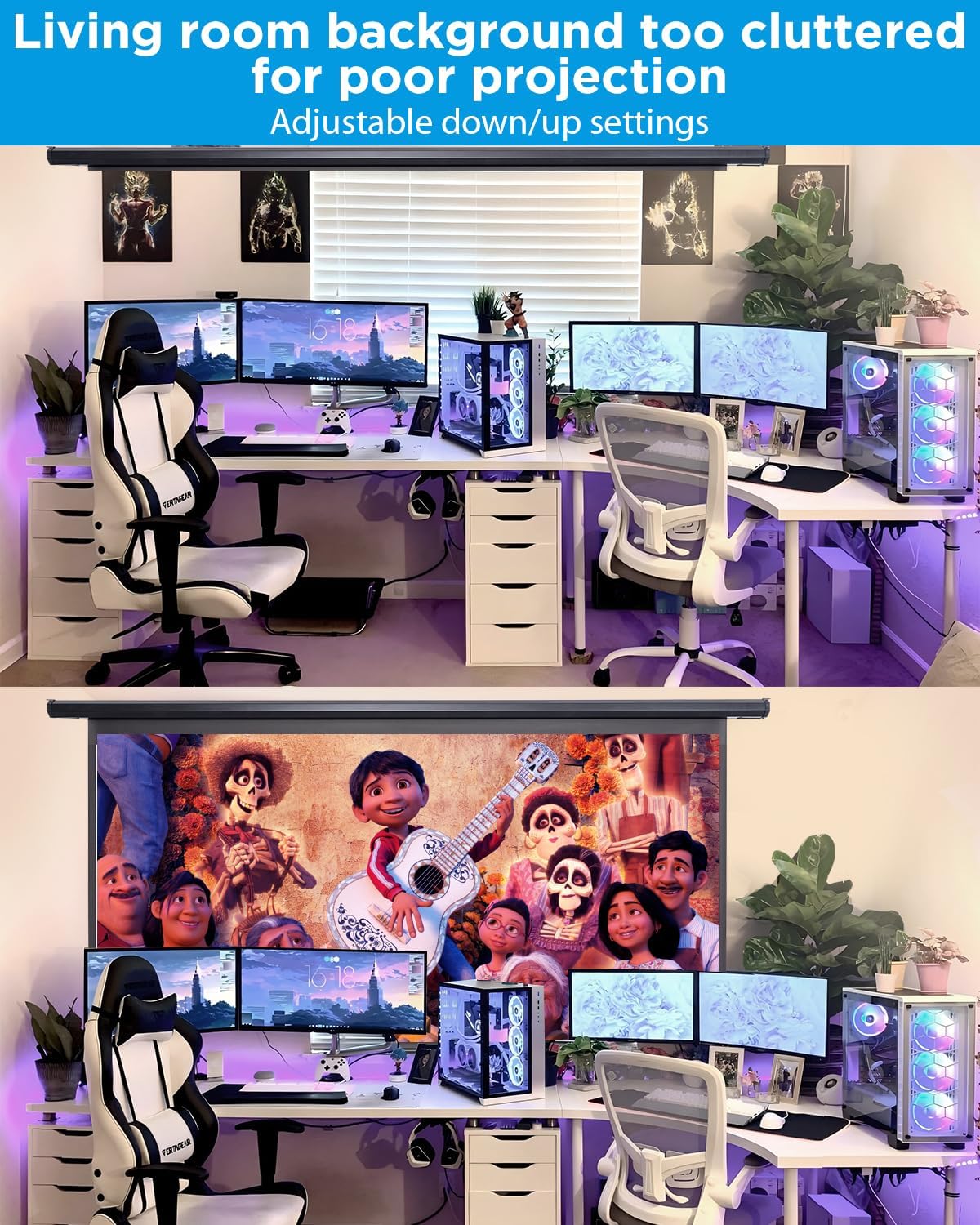 - 4-LAYER PREMIUM PVC MATTE PROJECTION SCREEN: If you can't get a clear projection with a screen, why not project directly onto a white wall? Our projector screen has a high gain of 1.2 and is compatible with 3D, 1080P, 4K and Full HD images, and the 4-layer black backing eliminates light penetration and produces a high-quality projection that ensures excellent color reproduction. It can be easily wiped and cleaned with soap and water.