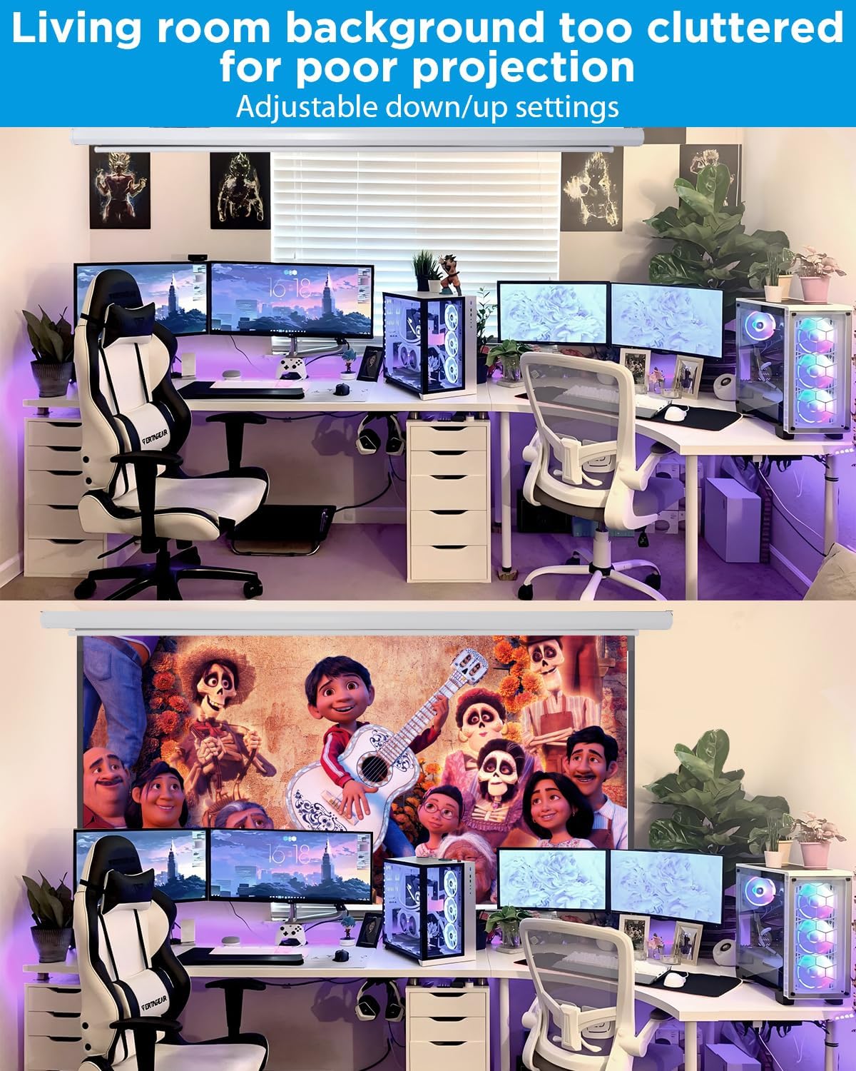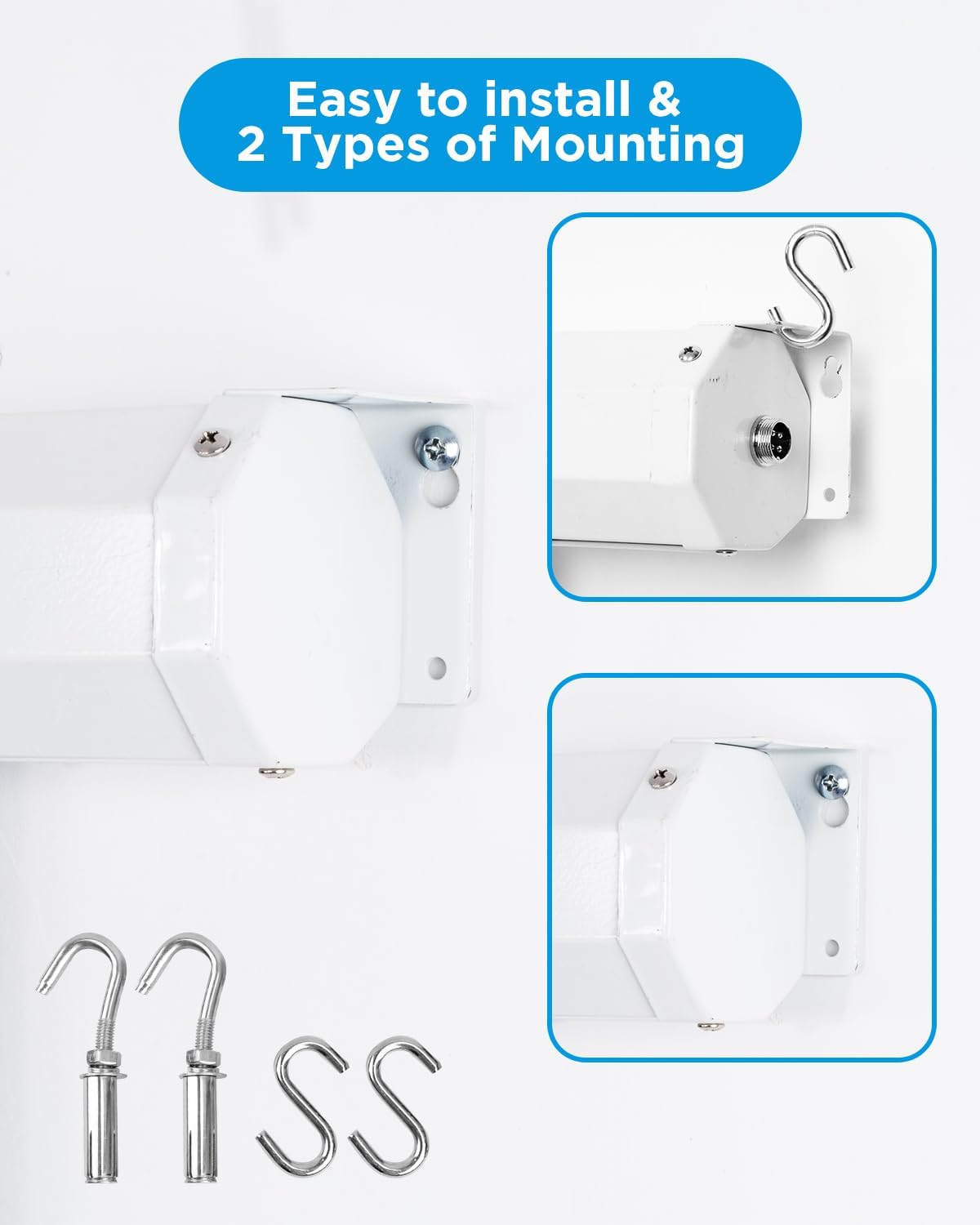- EASY TO INSTALL WITH ACCESSORIES: Our motorized projection screen comes with an extension power cord and ceiling hook accessory for easy wall or ceiling mounting. Housed in a sturdy metal casing, this motorized projection screen is resistant to warping and damage, providing long-lasting reliability for both indoor and outdoor installations. When not in use, simply retract the screen to prevent pet scratches, children's graffiti or accidental scratches and maintain a pristine viewing surface.
