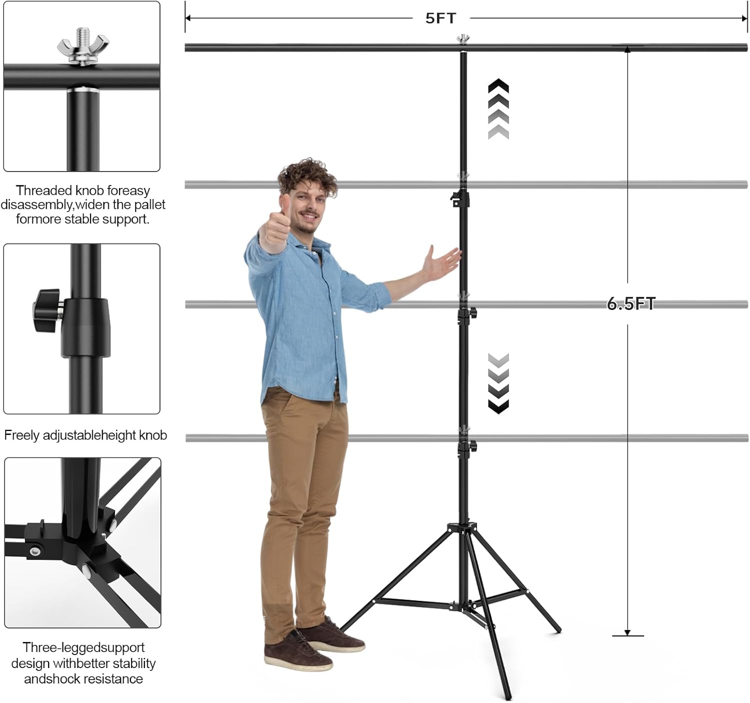 - ADJUSTABLE STAND BACKDROP KIT - This 5x6.5FT Black Screen Backdrop kit is made of high-quality steel for durability and long life. After assembly, it is stable and not easy to scratch. It can adjustable from 2.69ft(82cm) to 6.5ft(200cm) in height. It has an adjustable telescopic mechanism. Features adjustable telescoping mechanism for raising and lowering