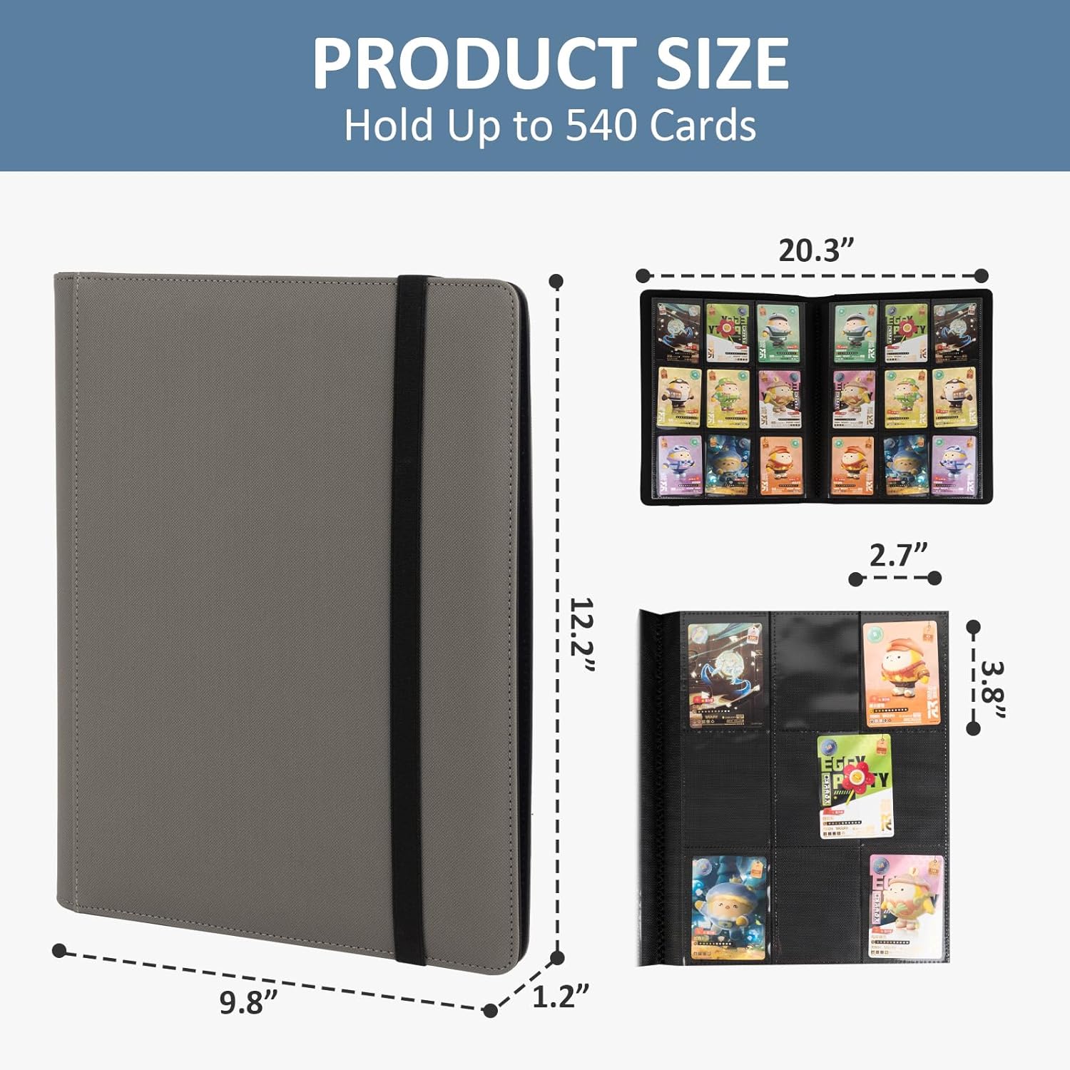 Trading Card Binder 9 Pocket, Fvxldcz PU Cover Card Collection Binder 540 Cards Sleek Side-Loading Card Album, Sturdy Card Collection Folder for TCG, MTG, Yugioh, Sport Cards (Gray-2)
